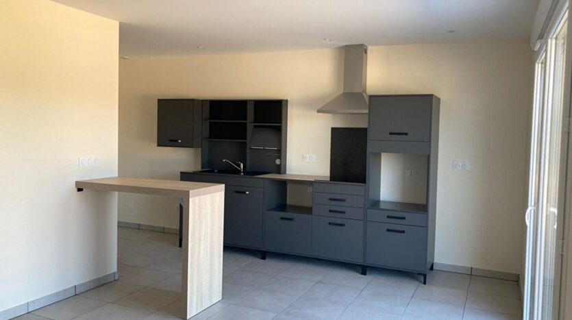 RDC : Cuisine ouverte sur un séjour lumineux.