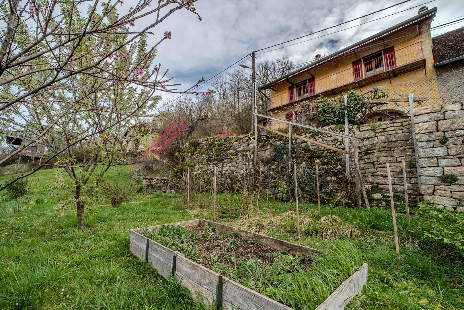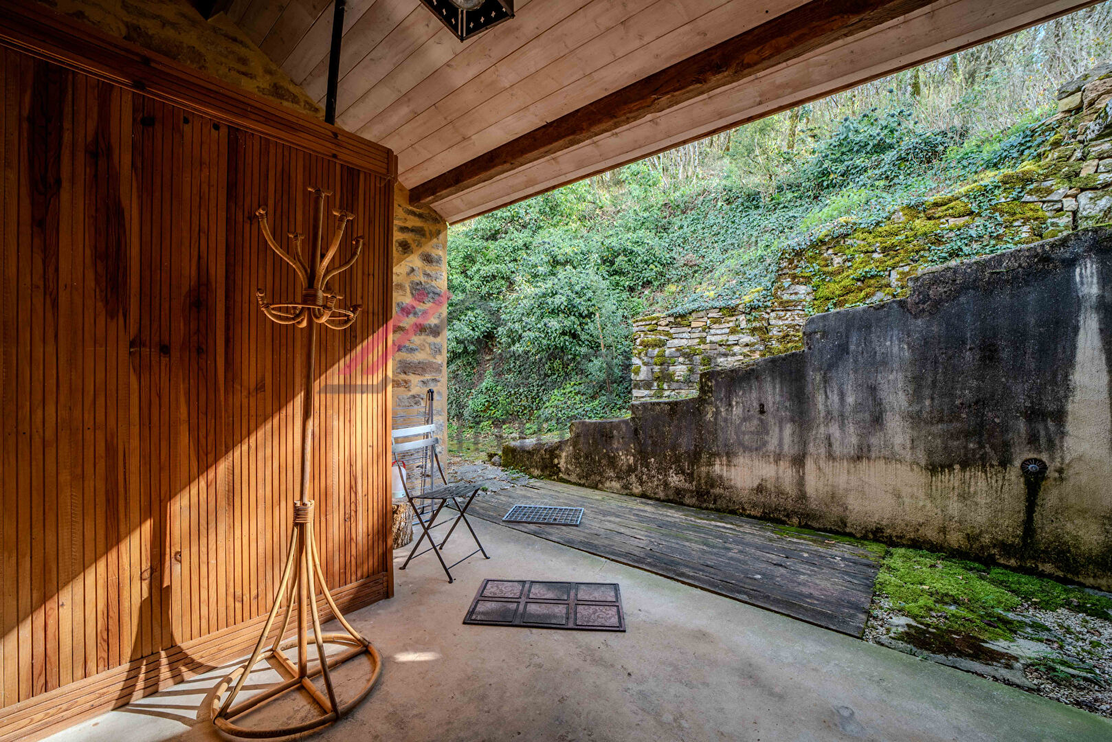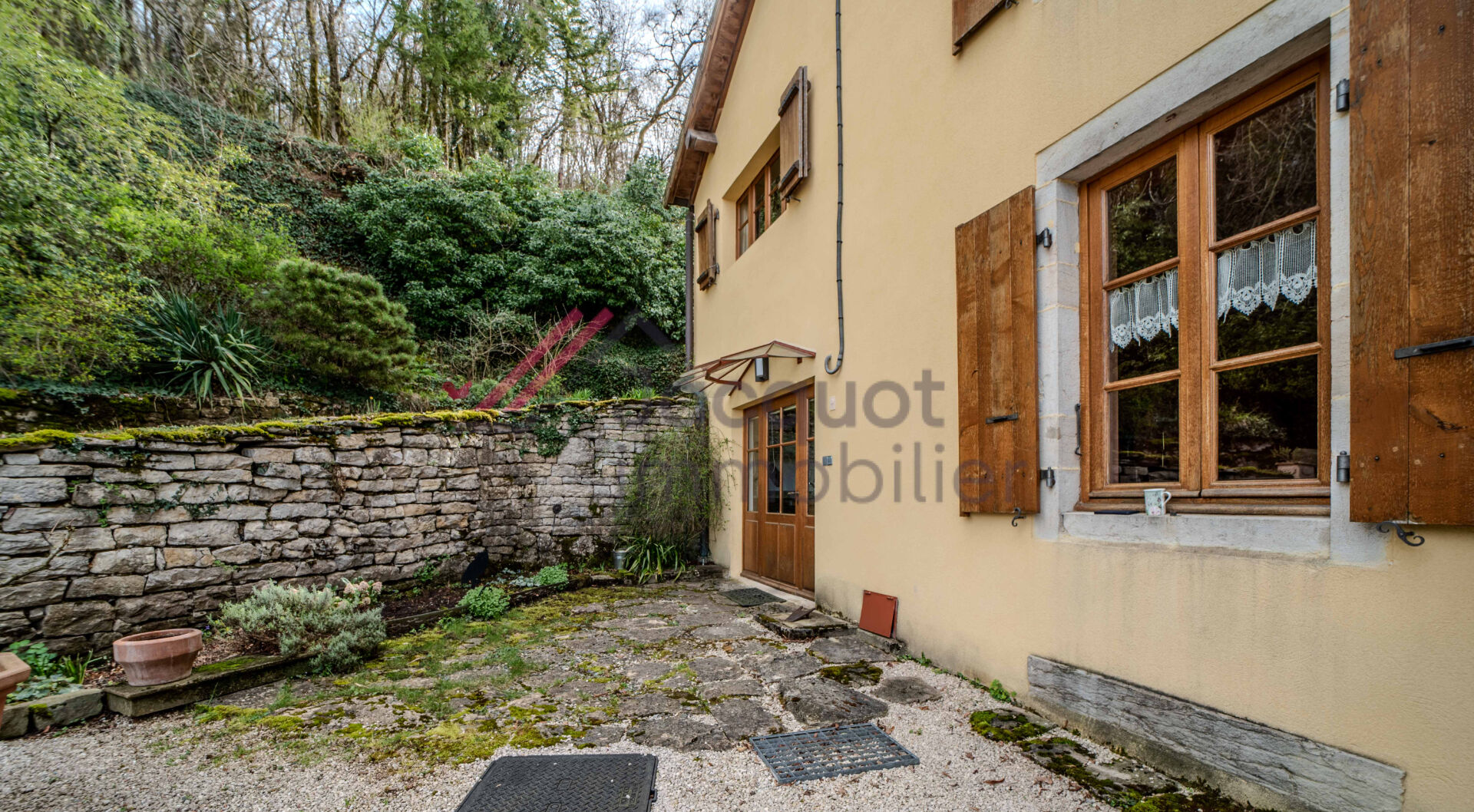 A l’extérieur, vous profiterez d’un terrain avec un jardin en contrebas, ainsi que d’un bois attenant.